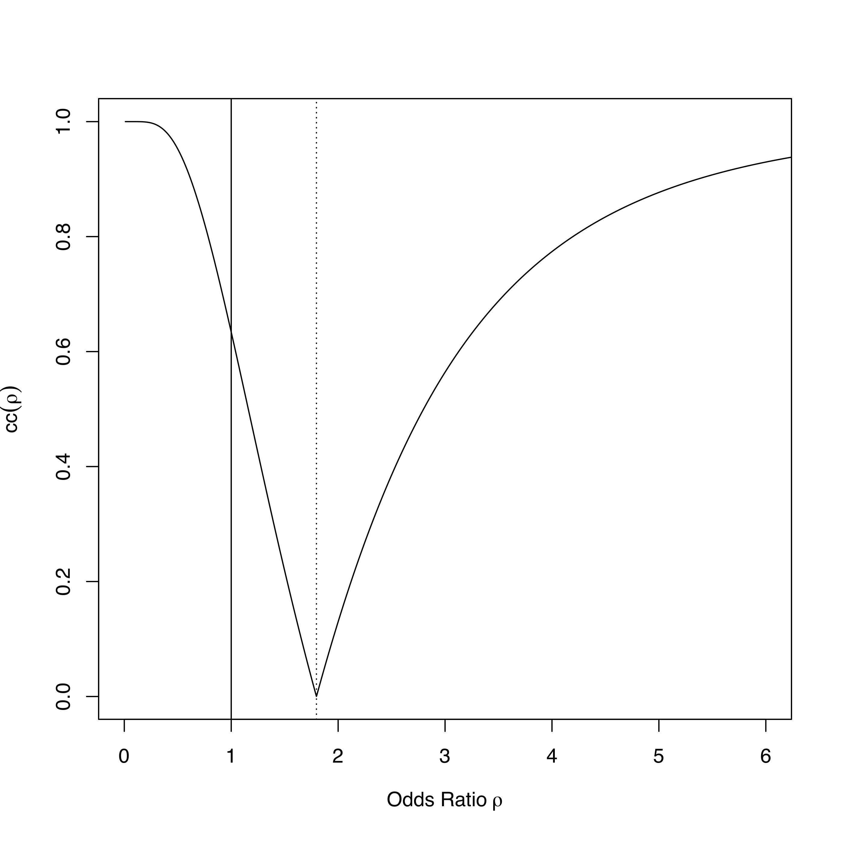The odds ratio \(\rho\) is a quantity used in medical research to compare binary outcomes under two different treatments. An odds ratio of 1 indicates that there is no difference between the two treatments.